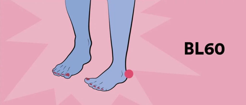 Où le trouver : Le point BL60 se situe à quelques centimètres en dessous du point SP6, pile au milieu entre l’os de la cheville et le tendon d’Achille.