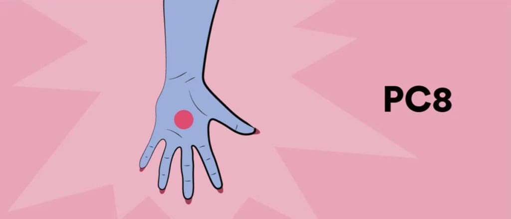 Où le trouver : Le point PC8 se situe en plein milieu de votre paume. Si vous serrez le poing, c’est là que le bout de votre majeur touche votre paume.