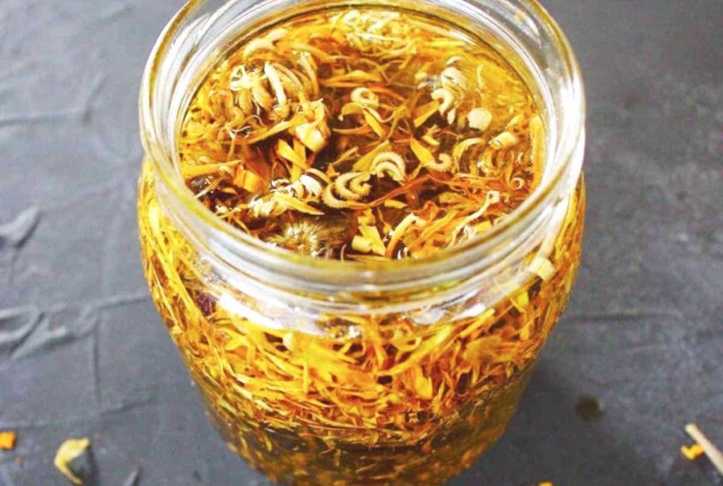 Vous pouvez réaliser très facilement votre macérat huileux de calendula à la maison en laissant infuser des fleurs de souci dans de l’huile végétale © Naturelle Maman