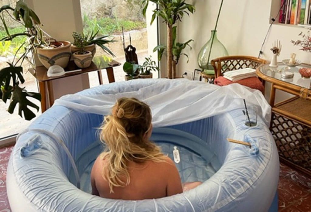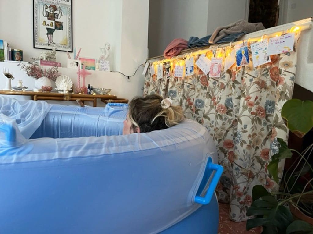 J’entre dans la piscine d’accouchement chaude louée pour l’occasion, et c’est si agréable.