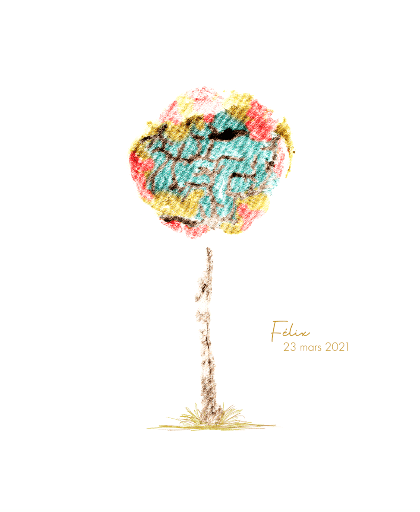 Nous avons pu faire le clampage tardif de son cordon ombilical et réaliser une empreinte de son placenta, que j’ai ensuite fait retouchée par une artiste québecoise.