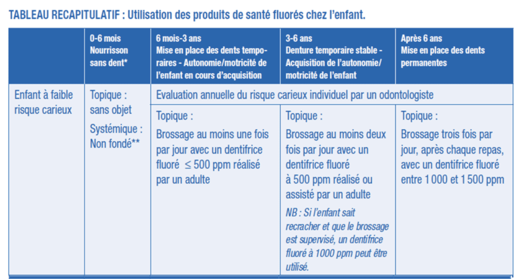 La place du traitement systémique, en complément d’un topique (dentifrice fluoré inférieur ou égal à 500 ppm) était précisée et qualifiée de « non fondée » chez les enfants de 0 à 18 ans avec un faible risque de caries.
