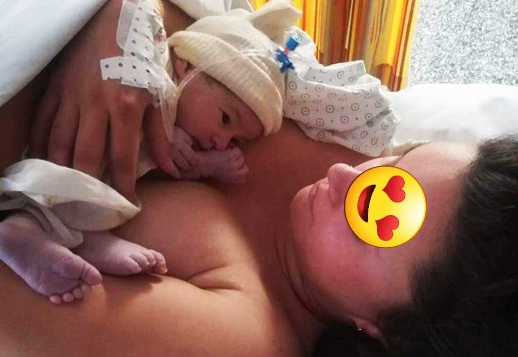 Clampage du cordon par papa, peau à peau avec papa pendant qu’on s’occupe de moi, car j’ai eu une petite déchirure qui nécessite 3 points de suture.