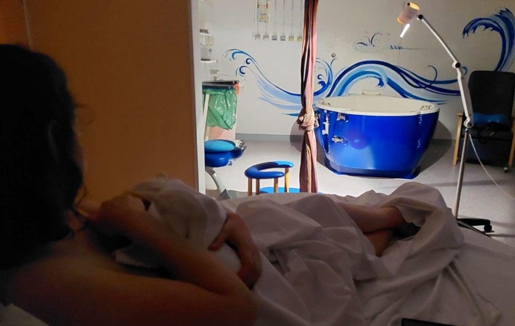 J’avais dit en amont à mon mari que j’aimerais vivre une partie des contractions dans la baignoire, pour me détendre et soulager la douleur ; il le demande à la sage-femme qui me fait couler un bain. Je m’y glisse entre deux contractions.